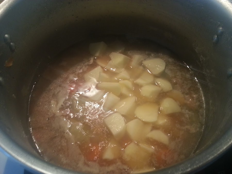 7. - Troceamos unas patatas y las añadimos a la verdura y los garbanzos.