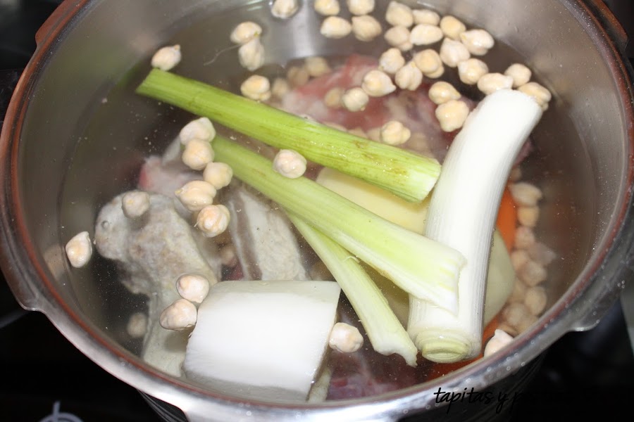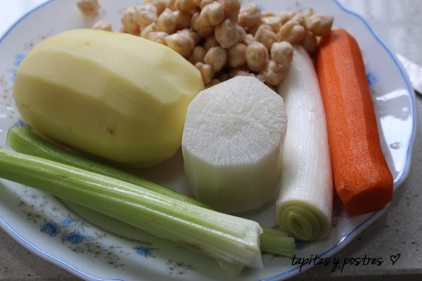 La verdura: zanahoria, nabo, apio, puerro y patata. Todo entero por si hay que retirarlo que sea más fácil. Y los garbanzos que habremos tenido en remojo una noche. Yo pongo muchos garbanzos en remojo a la vez y luego congelo los que no uso, así siempre los tengo listos.