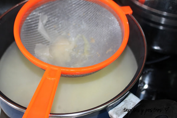 Yo aparto el caldo que voy a congelar, para tener sopa para otros días. A este caldo le eché un poco de arroz.