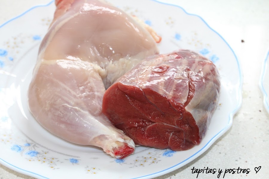 El muslo de pollo sin piel y el trozo de jarrete de ternera. hay quien usa otros tipos de carne, como he dicho mas arriba esta es la receta de mi madre y esto es lo que ella usa.