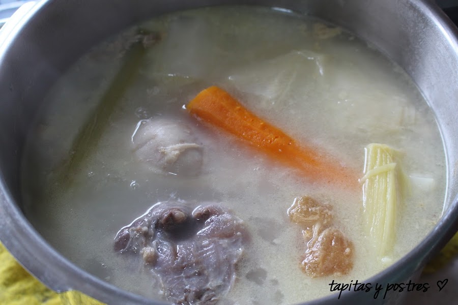 Y el hueso, la manteca y el trocito de costilla, todo añejo. Esto da un gusto muy bueno al caldo. Yo no pongo tocino, no nos gusta. Ya con esto sale un caldo muy sabroso. No echéis más que una pizca de sal, que si no os saldrá muy salado.