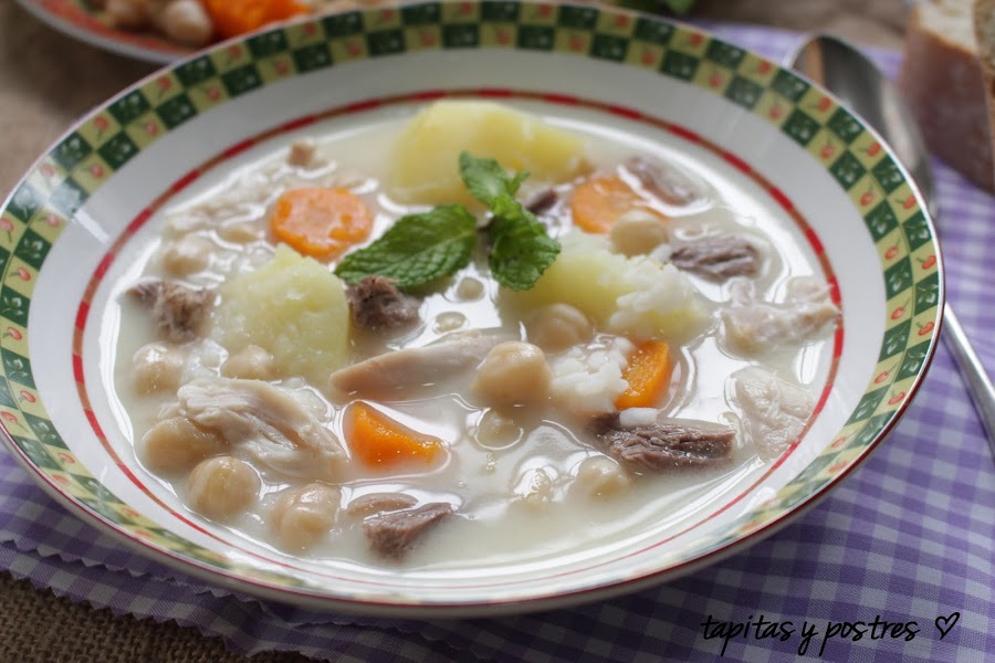 Y al caldito de puchero con arroz le desmenuzamos un poco de pollo y ternera, le troceamos un poco de verduras y añadimos garbanzos. Unas hojitas de hierbabuena ponen el punto a este guiso familiar.