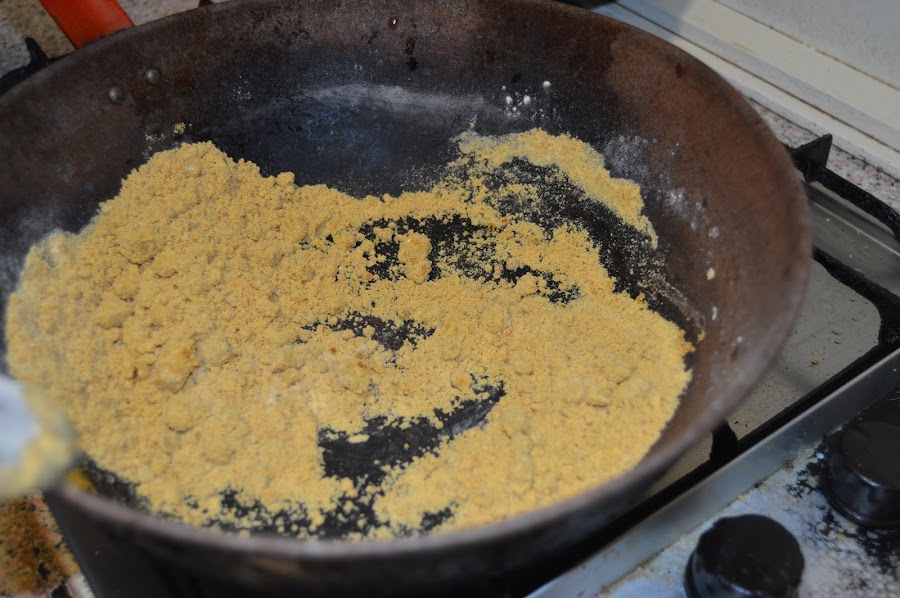 Ponemos al fuego el aceite que ha soltado la panceta y las salchichas rojas y echamos la cucharadita de pimentón rojo, removemos un poco y acto seguido echamos las cucharadas de harina de almorta (dependiendo de las personas), removemos hasta que absorba bien el pimentón.