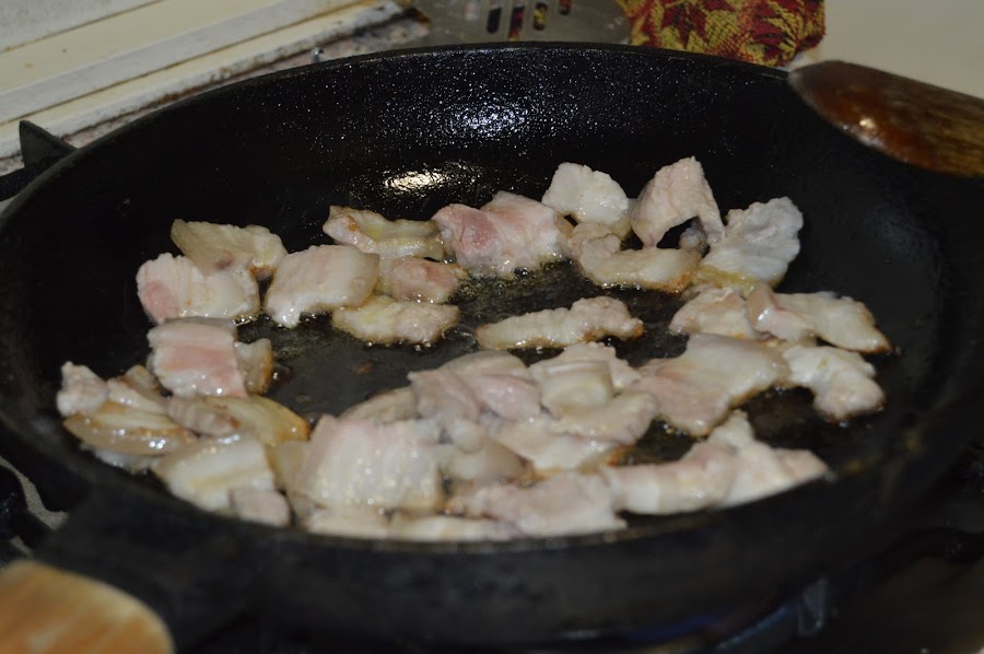 Freímos en una sartén, por separado, la panceta y las salchichas rojas. Lo sacamos de la sartén y reservamos poniendo un papel absorbente para que absorba la grasa.