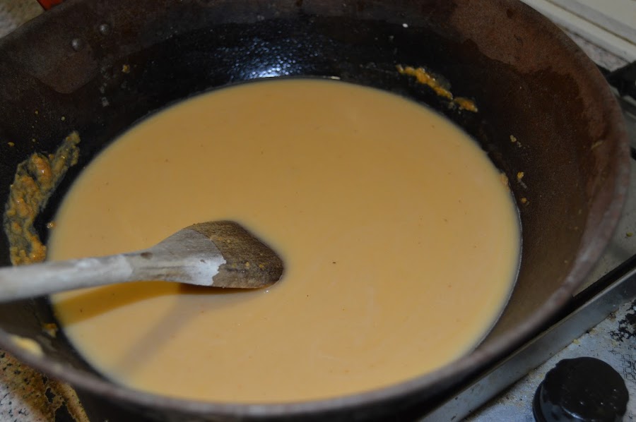 Y comenzamos a echar los vasos de agua, debemos remover hasta que no queden grumos y empiece a espesar.