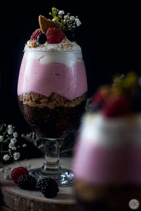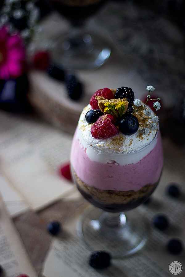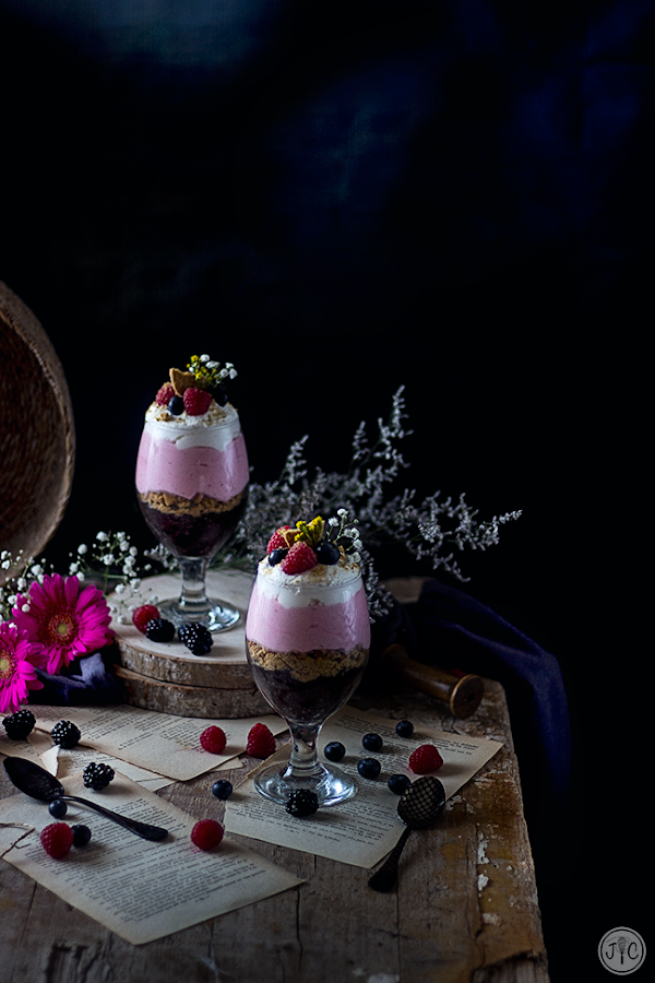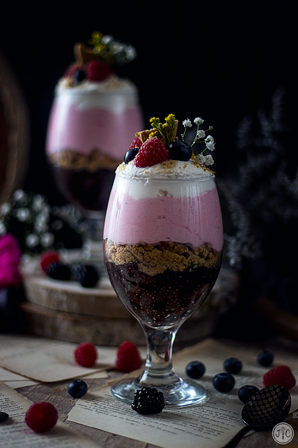 Pero una de las cosas que más me gustan de este postre es la cantidad de colores que tiene por las diferentes capas que he puesto: marrones, rosa y blanco. Una combinación ganadora, como la mezcla de los diferentes sabores de cada una de las capas. Soy un fanático de los frutos rojos así que no podían faltar coronando este postre que seguro que lo voy a repetir varias veces este verano. ¡Tenéis que probarlo porque está de muerte!