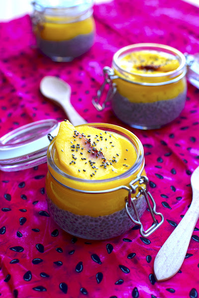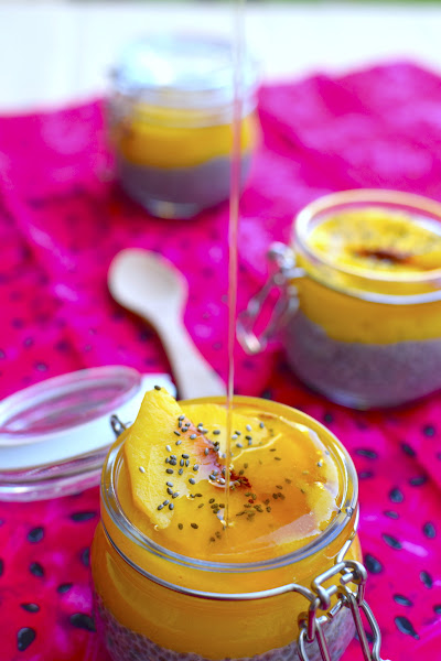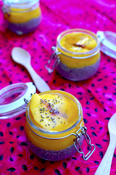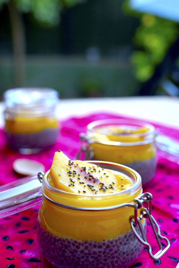 3. Al día siguiente, sacamos nuestro pudding de chía y removemos bien. Podéis añadir un poco más de leche para aligerarlo si lo veis muy espeso. Rellenamos nuestros vasitos individuales hasta la mitad y añadimos encima el puré de melocotón. Decoramos con unos gajos y unas semillas de chía por encima.