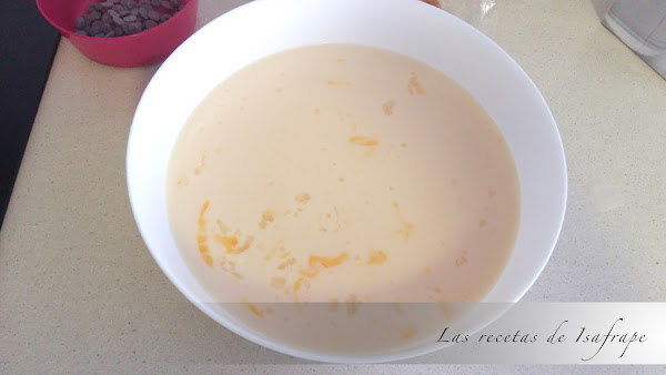 Mezclamos el chocolate blanco, la leche, los huevos y el azúcar hasta que quede todo bien integrado.