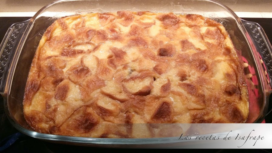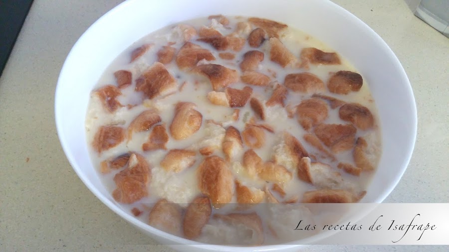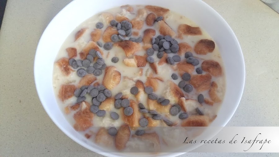 Agregamos los croissants cortados a pellizcos y las gotas de chocolate. Empapamos bien los croissants en la mezcla.