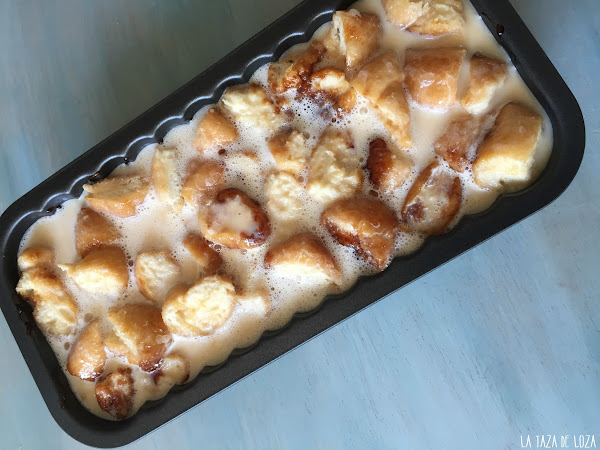 En esta imagen inferior podéis ver el corte de este pudding, estos trozos de donuts se pueden triturar o dejarlos como he hecho yo con este dulce, solo cortados. No los trituré, pues pensé que me gustaría más con diferencia entre la textura del flan y esa parte más..."bizcochito". Esta receta se podría hacer con otro tipo de bollería del día anterior, así que también es una receta de aprovechamiento, ideal para cualquier día, por ejemplo, con suizos o bizcochos nuestros caseros...en mi casa a veces quedan restos olvidados y casi duros en el cajón del pan...pero yo lo confieso. Nadie es perfecto.