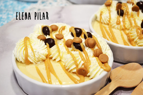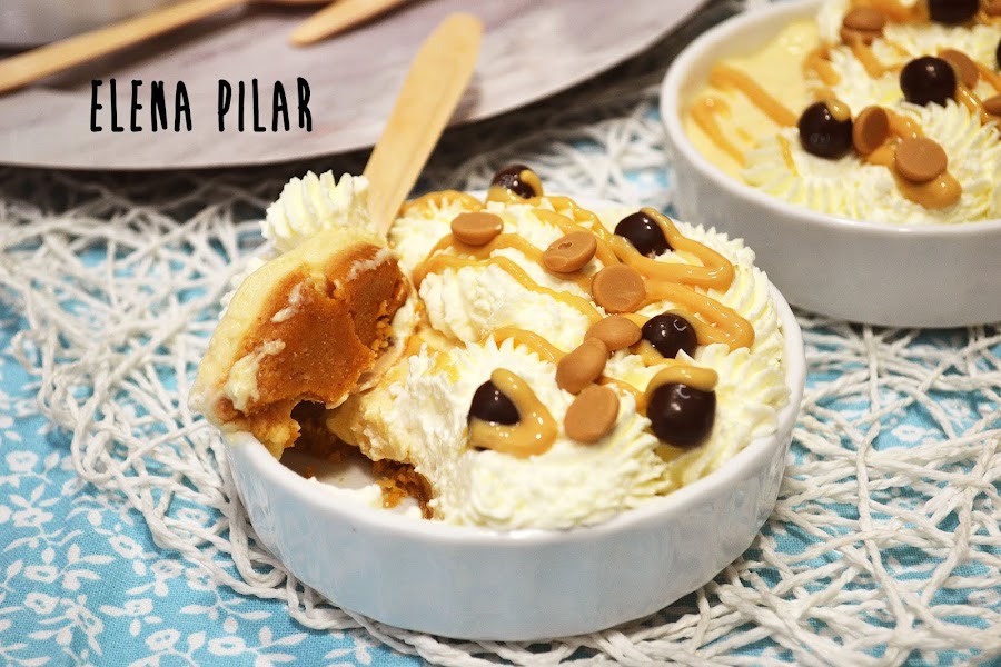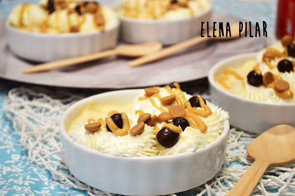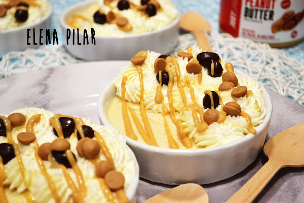 Cuando la crema esté bien fresquita (yo la hice la tarde anterior para comerla de postre al día siguiente), montamos la nata (crema de leche) con la vainilla y el edulcorante. Formamos rosetones sobre la crema y decoramos con unos hilitos de mantequilla de cacahuete. Por último, añadí unos Conguitos ^_^. Reservamos dentro de la nevera hasta que lo vayamos a consumir.