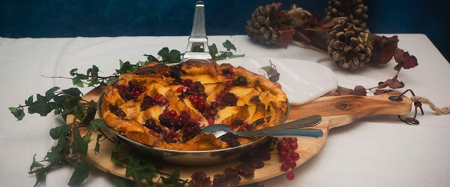 A mi me gusta presentarlo a la mesa directamente en la sartén o molde donde lo he preparado y allí que cada cual se eche lo que quiera, así en confianza os diré que a mis hijos y a mi nos gusta meter la cuchara en el recipiente directamente. Se puede tomar tibio acompañado de helado de vainilla o con creme fraiche o nata (crema de leche), realmente todo un capricho para una tarde de domingo mientras vemos una película con los nuestros.
