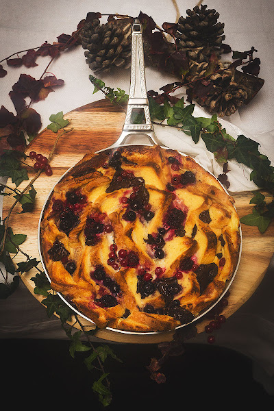 Podemos hacer tantas versiones de éste pudding como ingredientes tengamos a mano, aunque la base fundamental siempre es la misma, cualquier pan o bollería atrasada remojada en una royal elaborada a base de leche, nata (crema de leche), huevos y azúcar, a partir de ahí podemos añadir lo que mas nos guste, en mi caso tenía en la nevera frutos rojos congelados que me quedaban de la navidad y que he aprovechado para dar un toque ácido y de color que tanto me gusta en mis platos y por supuesto, siendo como somos en casa tan chocolateros, no me he resistido a añadir unas onzas.