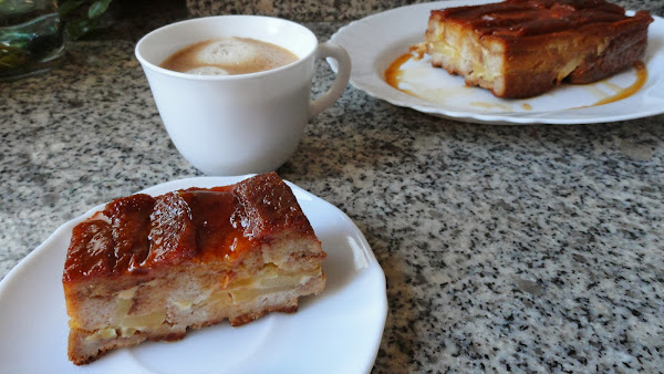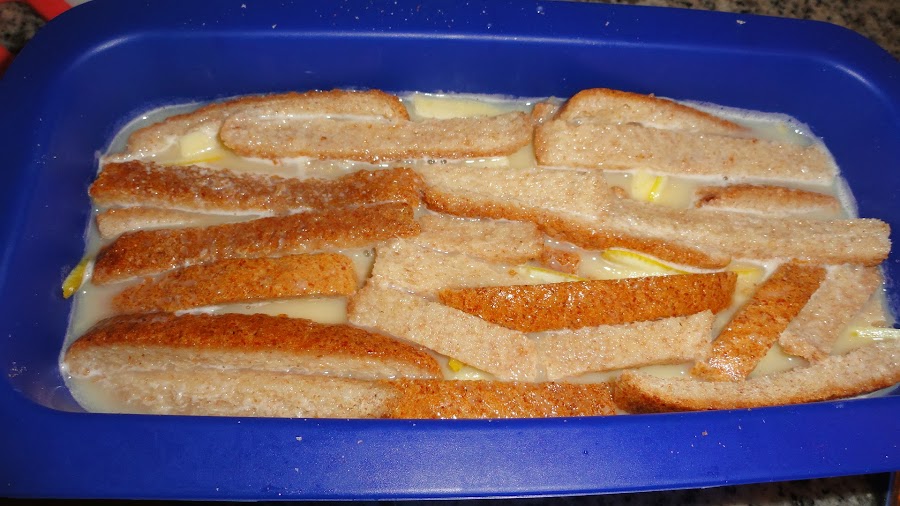 He puesto caramelo líquido en un molde de silicona. Encima he colocado las tiras del pan de molde, y la manzana cortada igualmente en tiras. Las tiritas de limón (aunque se han quedado un poquito enteras, mejor rallar el limón si no os gusta encontraros los trocitos o bien aromatizar con canela o vainilla).Y encima más cortezas de pan de molde. He batido los tres huevos con la leche, el chorrito de ron, y el azúcar. He cubierto los trozos de pan y de manzana con esta mezcla y lo he cocido al horno a 200º al baño maría, durante aproximadamente 40 minutos.