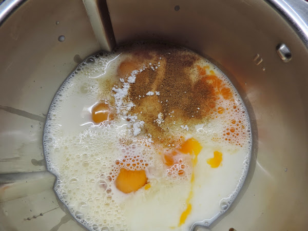 Poner en el vaso del thermomix la leche, azúcar, canela, ralladura de limón y huevos.