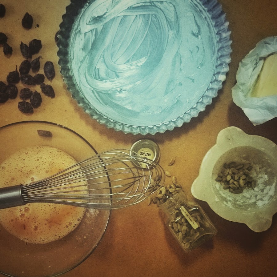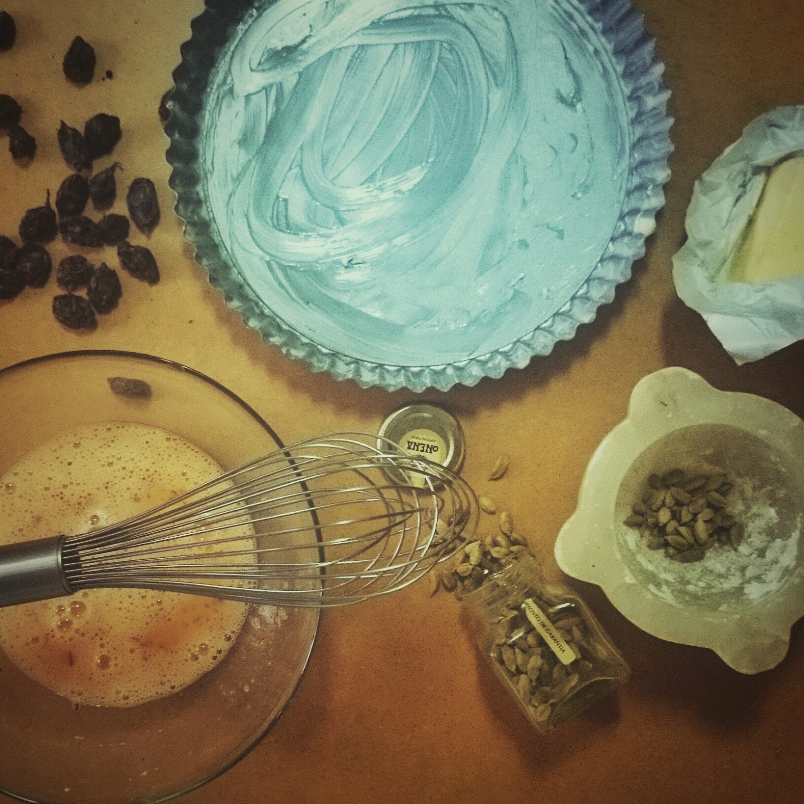 En un mortero ponemos el azúcar y las semillas de cardamomo. Machacamos un poco y lo ponemos en un cuenco grande.