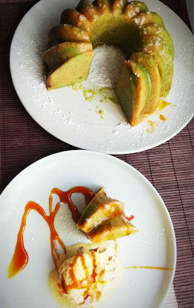A la mezcla que nos queda, le echamos el extracto de pandam, removemos y echamos encima de la mezcla que ya está en el molde. Se supone que yo quería hacer unas vetas de color verde, pero tuve el fallo de echarle el pandam a mucha cantidad de masa y al final quedó un color homogéneo. Si tú no usas pandam, pues echas toda la mezcla de una vez en el molde.