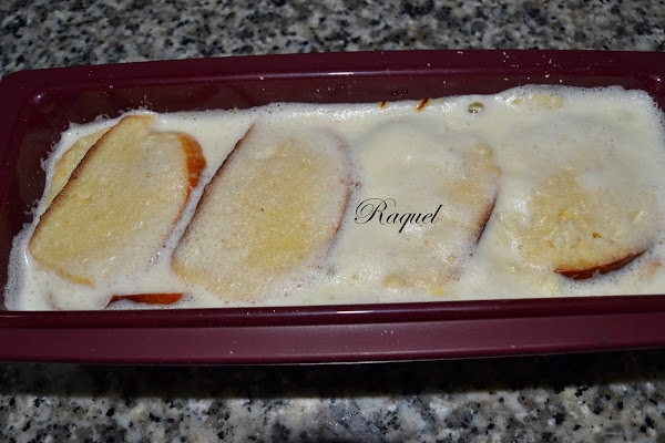 Cortamos el bollo a rodajas y iremos intercalando con el flan, hasta terminar la mezcla.