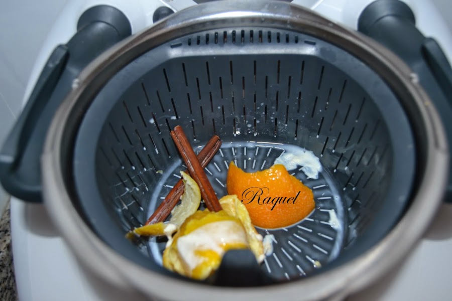 Ponemos la leche las pieles de el limón y la naranja y la rama de canela y programamos 7 min./ 100º /Vel. 1.