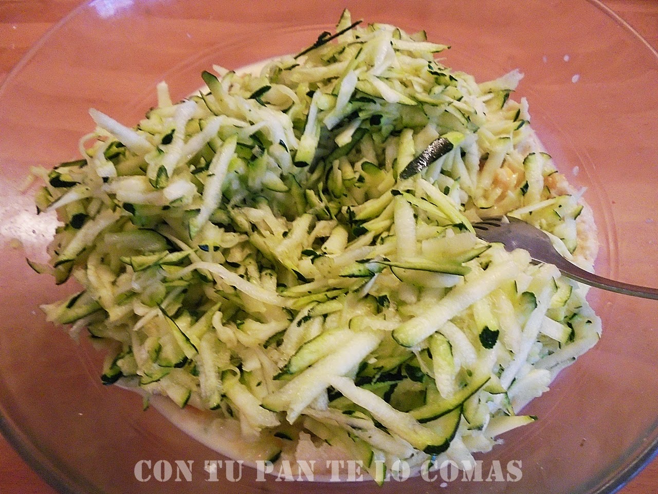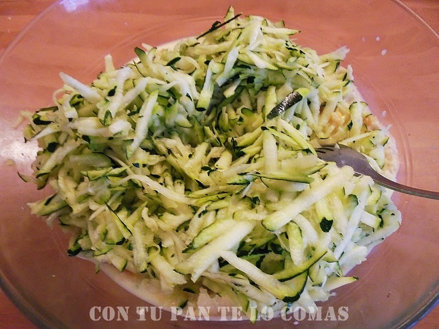 2. Rallamos el calabacín con piel y lo incorporamos al bol. Usa un rallador con agujero grande, que se vea... Ahora sazonamos todo con sal.
