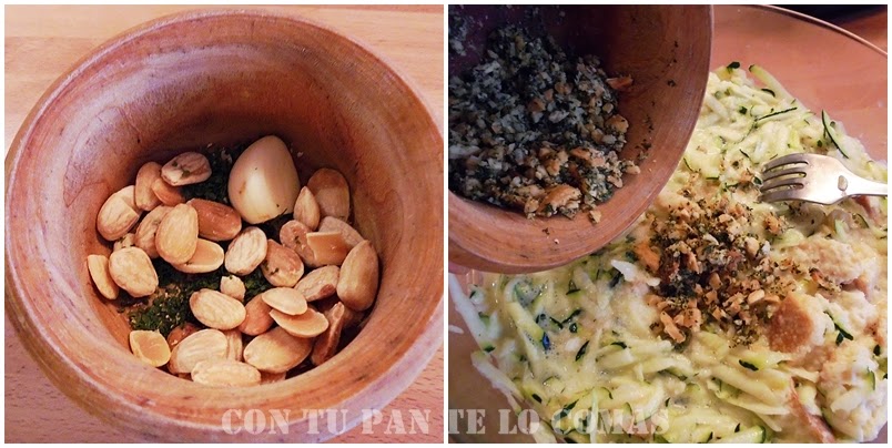 Bueno, pues aquí te traigo otra receta de aprovechamiento que siempre viene bien. Con ésta he aprovechado un poco de pan duro (como media barra) y un triste calabacín... aunque era grande, eso sí. Además tenía unas almendras con las que tampoco podía hacer gran cosa y también se las he añadido, pero si no tienes almendras puedes usar avellanas, cacahuetes o lo que tengas porque tampoco se necesita más que un puñadito. Como es una receta vegetariana, añadirle frutos secos nunca está de más.