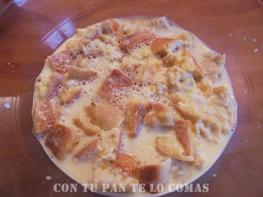 1. Batimos los huevos con la leche y añadimos el pan a trocitos dejando que se empape un buen rato.