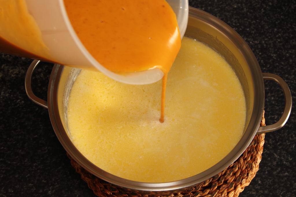 En un cazuela ponemos a hervir la nata (crema de leche). En una jarra o vaso batidor trituramos el resto de los ingredientes con la batidora.