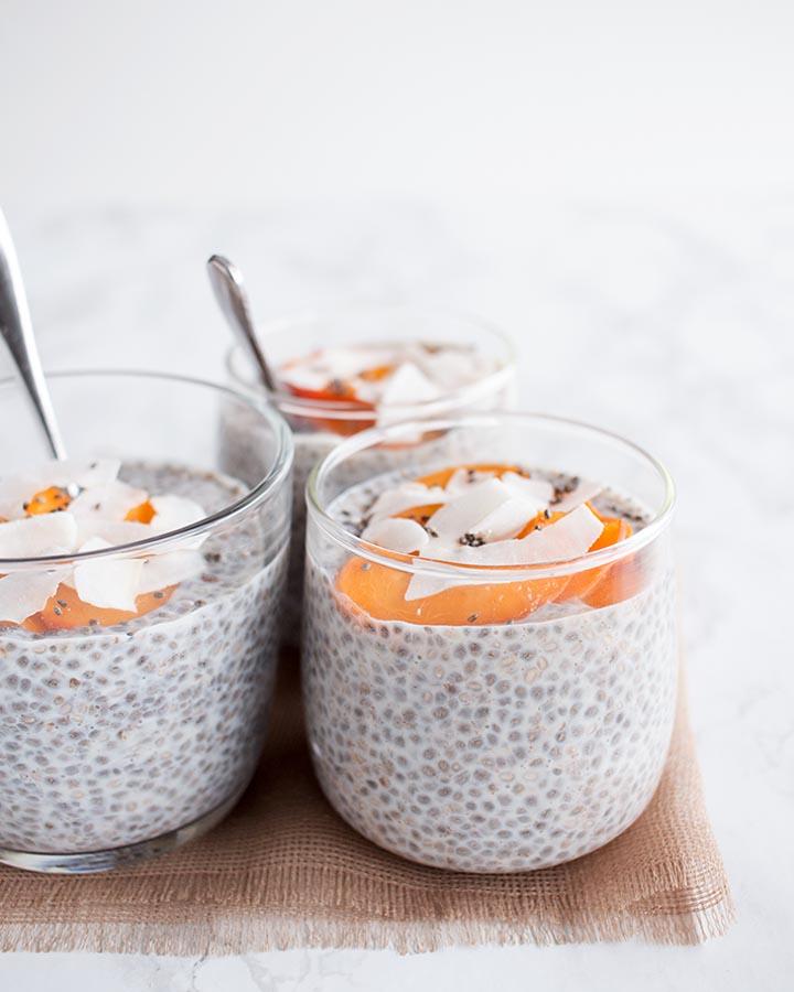 En unos vasos mezcla las semillas de chia con la leche, el sirope de arce y las especias. Deja reposar dos horas o toda la noche en el frigorífico, aguanta hasta 2 días sin problemas. Sirve con el albaricoque partido en trozos y el coco rallado por encima.