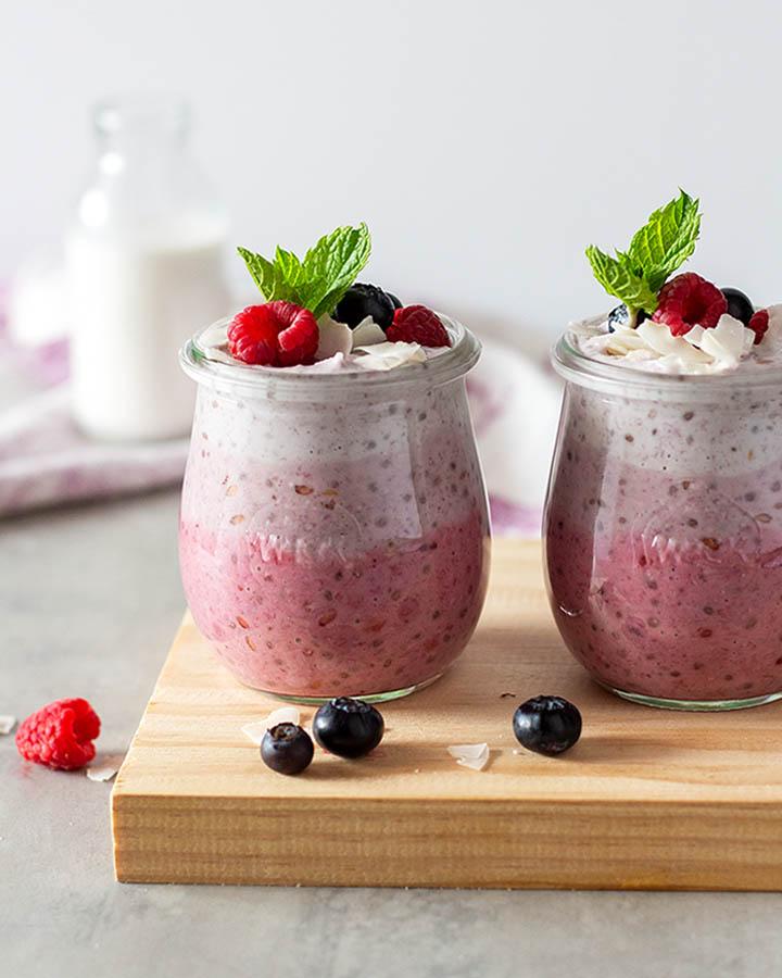 Mezcla la avena, la chía y la linaza con el agave y las frutas rojas que has triturado. Llena solo un poco los vasos con esta mezcla. Ahora añade al pudin unos 50 ml de leche de coco y mezcla bien. Añade la segunda capa de pudin a los vasitos. Y por último añade los 100 ml restantes de leche de coco al pudin y mezcla bien. Divide entre los vasos y esta será la última capa. Decora los vasos con los chips de coco, las frambuesas y la menta. Aguanta hasta 4 días en el frigorífico.