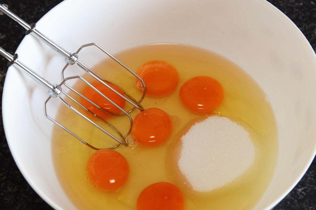 En un bol ponemos los huevos y el azúcar, batimos con las varillas eléctricas hasta que quede una mezcla espumosa.