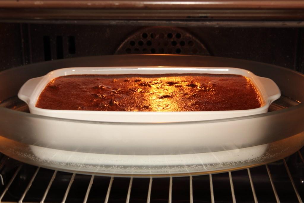 Llenamos una fuente con agua, la suficiente para que al hervir en el horno a baño María no se nos meta en el pudin. Introducimos la fuente con agua en el horno a 200ºC, calor arriba y abajo, hasta que hierva. Metemos el molde con el pudin en la bandeja con el agua hirviendo y horneamos durante 45 minutos. Cuando falten 10 minutos para terminar el horneado, bajamos la temperatura del horno a 180ºC, con el fin de que se cueza bien la parte central del pudin.