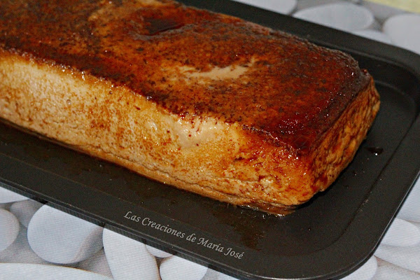 En un molde, apto para microondas, echamos caramelo y la mezcla.