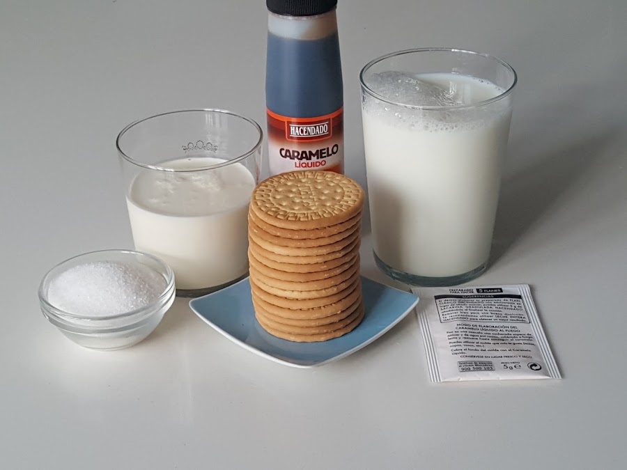 2. - Echamos en un cazo el resto de leche junto con la nata (crema de leche), el azúcar y las galletas y lo ponemos a calentar.