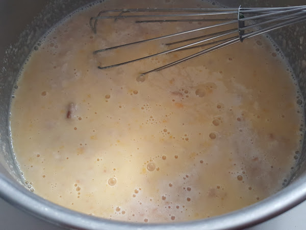 5. - Cuando la leche del cazo comience a hervir, le añadimos el preparado del flan y lo pasamos por la batidora, para que quede una crema fina.
