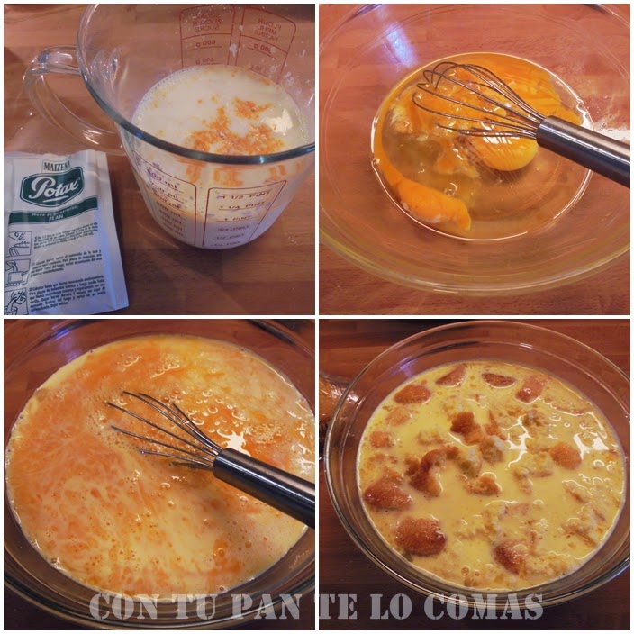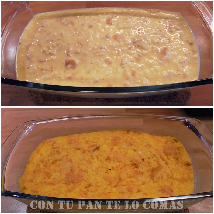 4. Desmenuzamos las magdalenas y las incorporamos a la leche y los huevos mezclando todo. Como verás no lleva azúcar porque las magdalenas ya son dulces. Si lo haces con pan, entonces tendrás que ponerle 4 o 5 cucharadas.