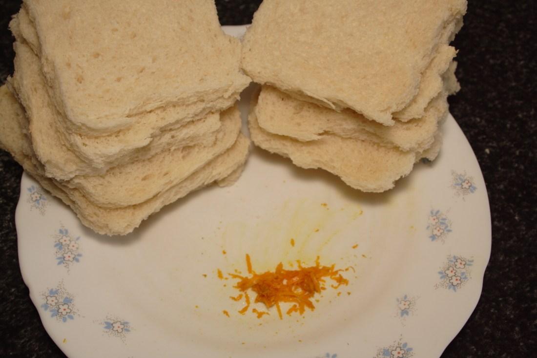 Sacamos la ralladura de naranja y el zumo y reservamos. Retiramos la corteza del pan. Reservamos.