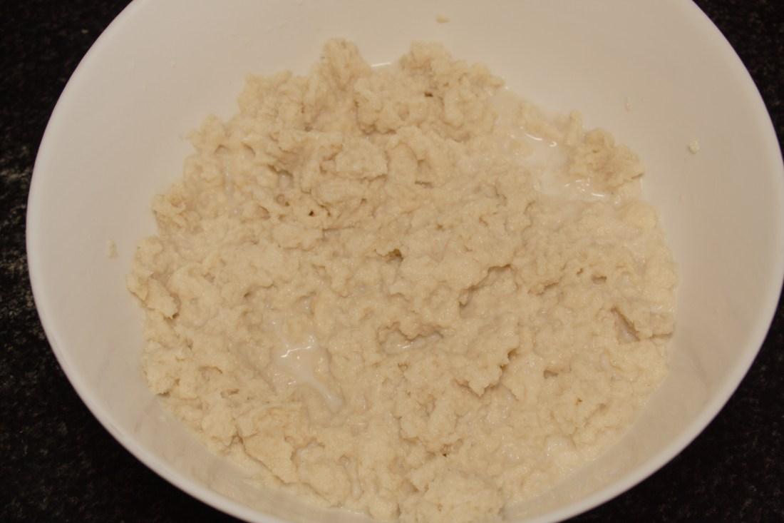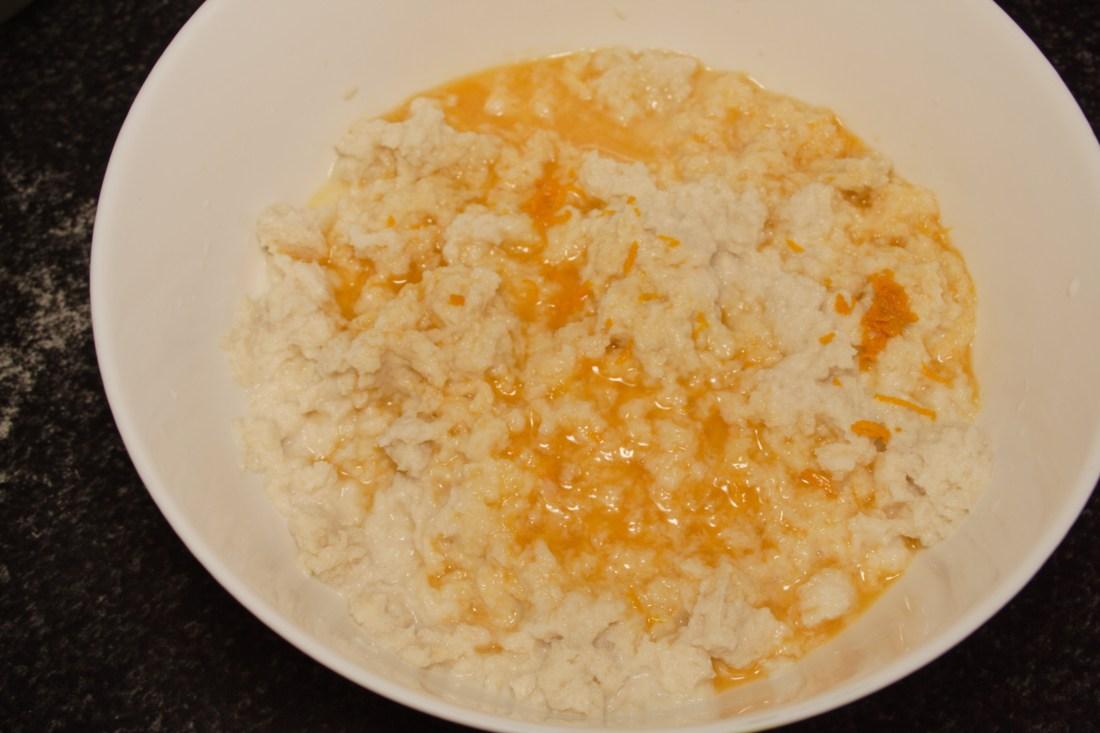 Lo desmigamos en un bol amplio, echamos la leche por encima para que se ablande, lo estrujamos un poco con la mano para que quede más menudo. Añadimos la ralladura y el zumo de naranja. Mezclamos y reservamos.
