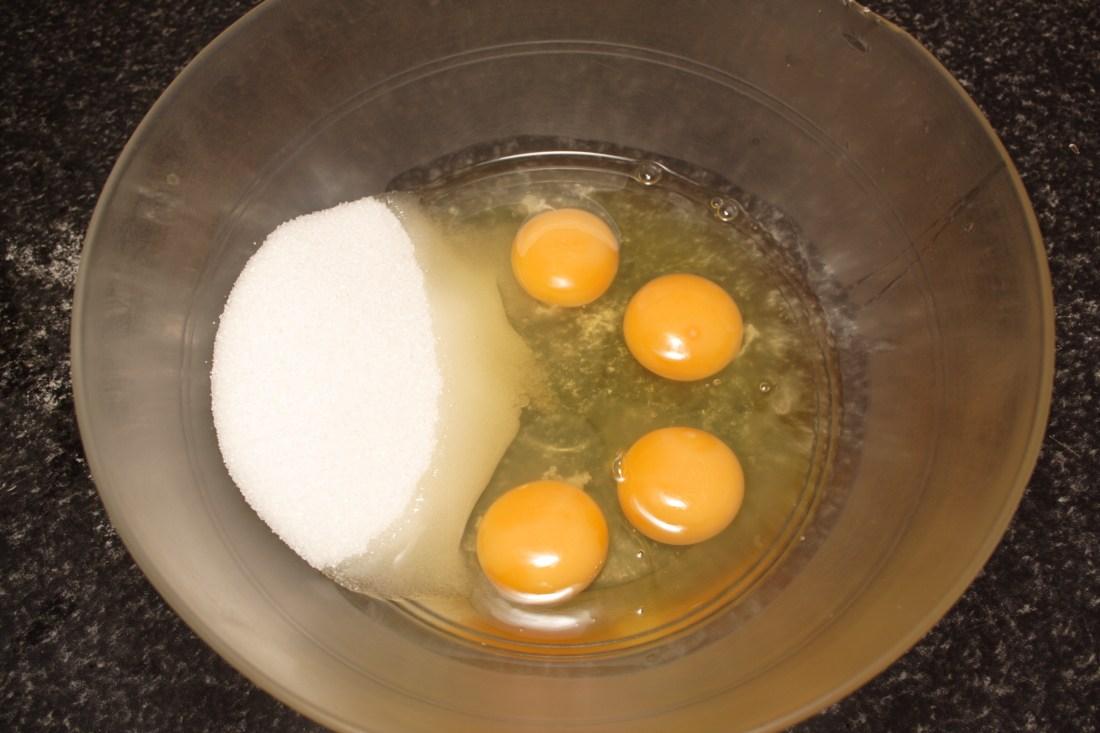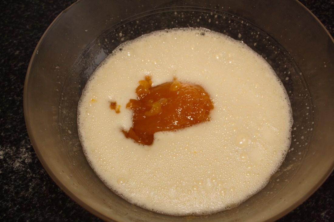 En otro bol cascamos los huevos, echamos el azúcar y batimos bien con las varillas eléctricas. Añadimos la mermelada de mango, seguimos batiendo.