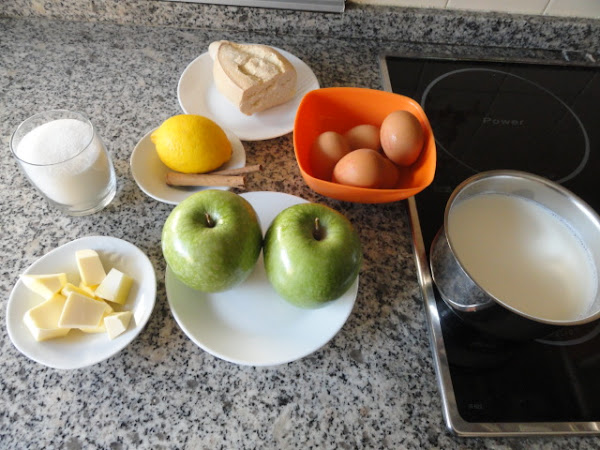 Batimos los huevos con el azúcar, (dejamos un poco de azúcar y preparamos un caramelo líquido), batimos bien y reservamos. Cortamos una de las manzanas en cuadraditos y salteamos con la mantequilla, dejamos templar. La otra manzana la cortamos en gajos y la ponemos en el molde previamente cubierto de azúcar. Sobre esta manzana ponemos el caramelo líquido. Mezclamos el pan con la leche junto con los huevos y la manzana salteada y mezclamos bien. Ponemos la mezcla en el molde sobre la manzana CUIDADO!!!! yo lo volqué muy de golpe y me movió todos los gajos, con lo que ha quedado más feo, pero muy rico. Poner la mezcla poco a poco para que no se muevan los gajos de manzana y así, al dar la vuelta os quedará como al chef.
