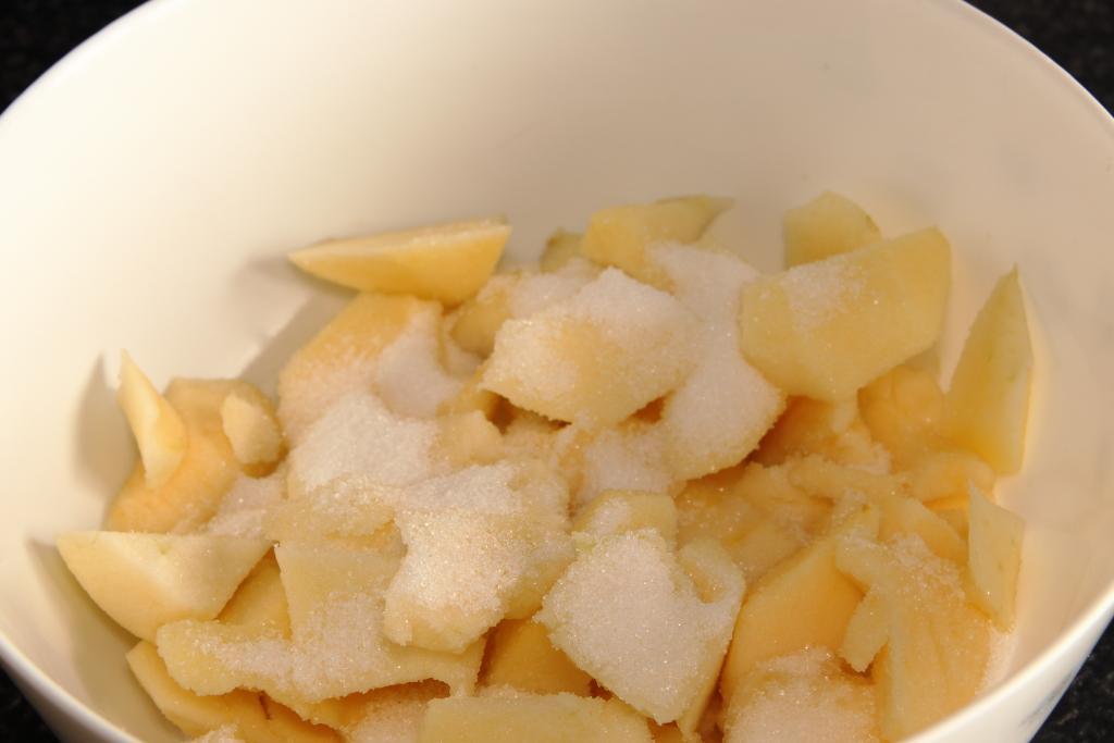 Pelamos y troceamos las manzanas no demasiado gruesas, las pasamos a un bol, embadurnamos con las 3 cucharadas de azúcar y las metemos en el microondas a cocer durante 8 minutos a plena potencia (tapamos el bol porque salpica). Sacamos y reservamos.