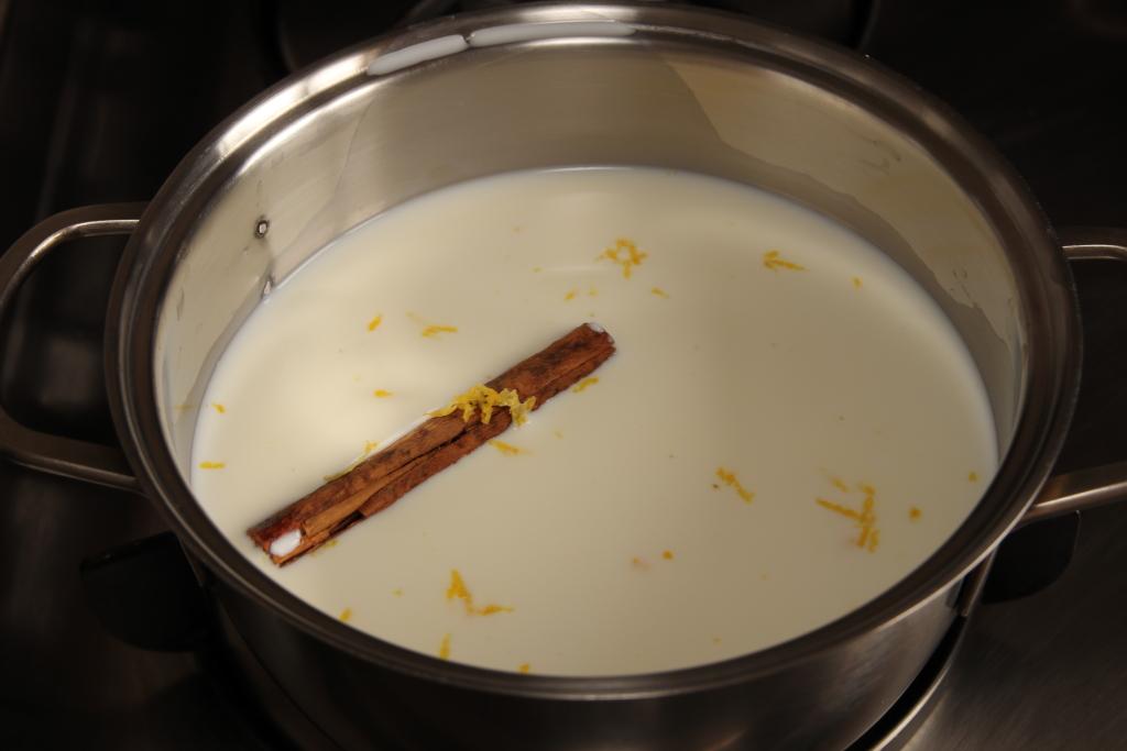 En un cazo calentamos la leche con el azúcar (las 4 cucharadas), la canela y la ralladura del limón, removemos para disolver el azúcar. Cuando rompa a hervir apartamos, retiramos la canela y reservamos.