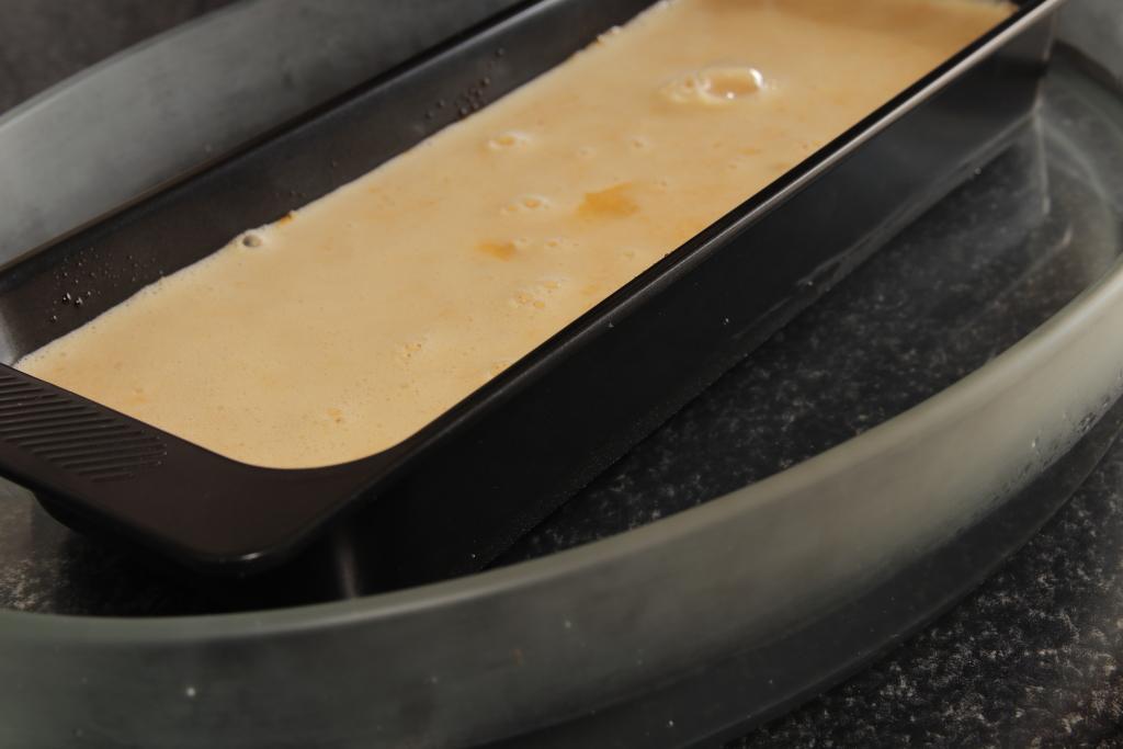 Escogemos un molde rectangular, pringamos bien la base y las paredes con el caramelo y reservamos.