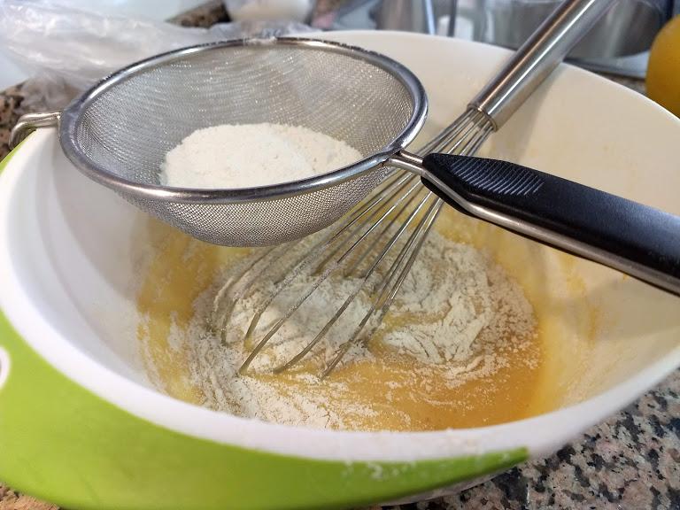 Mezclad la harina y la levadura y lo añadís también a la mezcla. Mejor si utilizáis un tamiz o un colador para conseguir que la harina quede suelta. Id mezclando, a medida que lvais añadiendo la harina, con movimientos suaves y envolventes.