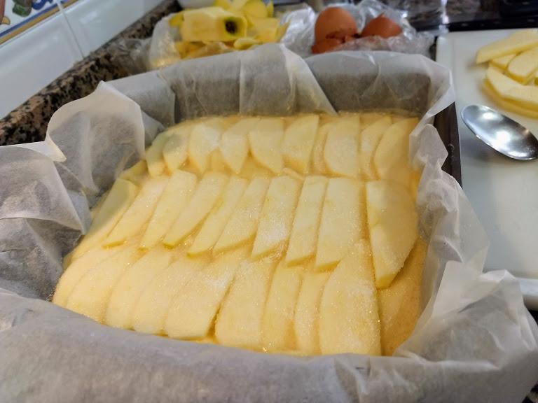 Pelad las manzanas, y las cortáis en trocitos pequeños. Podéis cortar también unas láminas finas para ponerlas por encima (espolvoreando un poco de azúcar sobre la manzana). Pero es opcional.