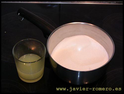 Para este o cualquier pudin o flan lo primero que hay que hacer es el caramelo líquido, para ello utilizamos un cazo de acero inoxidable y tras añadir el azúcar y el zumo de limón, procedemos a cocinarlo a fuego fuerte hasta que esté en el punto deseado. Lo siguiente es mojar las paredes del molde con el caramelo y esperara a que cristalice.