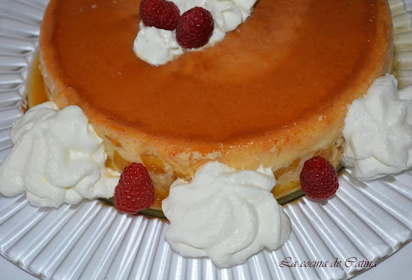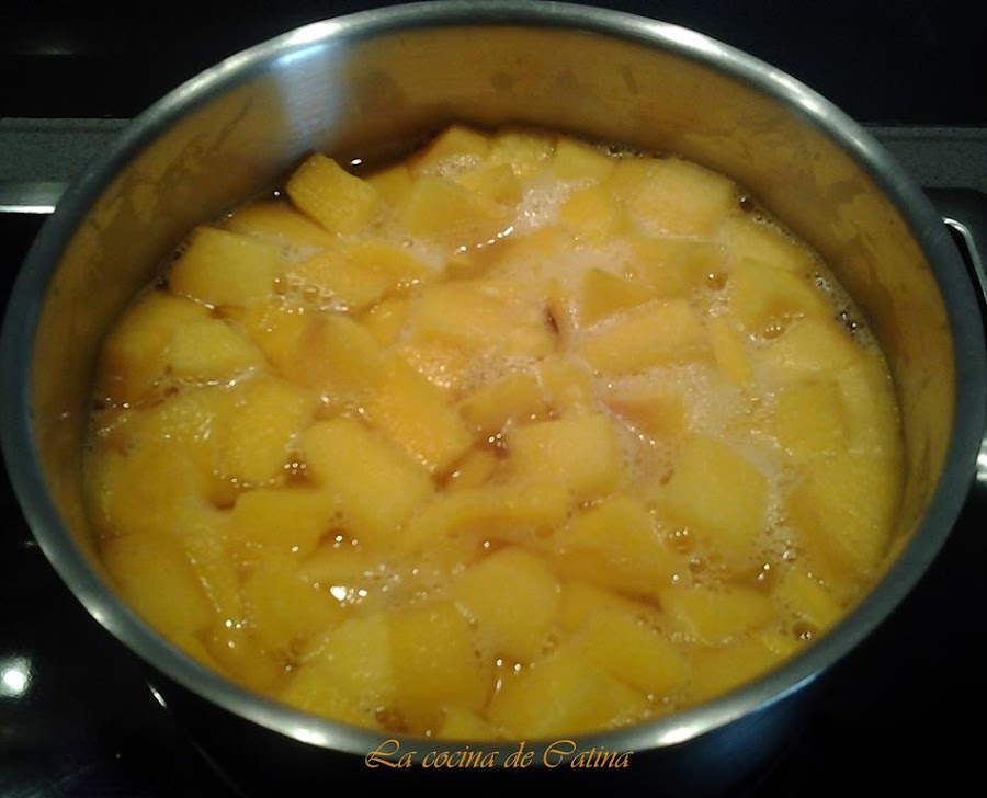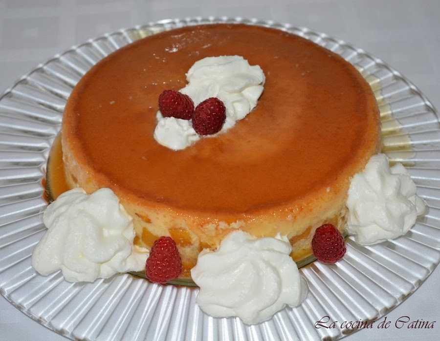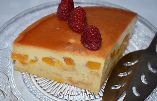 Este preparado se vierte sobre el molde caramelizado, incorporando luego los trozos de melocotón bien escurridos.