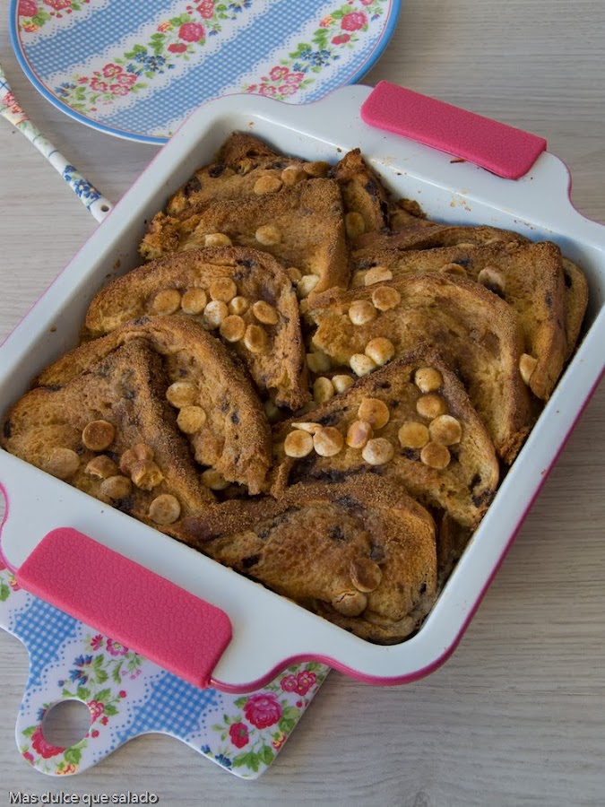 Mi versión es con pan de brioche con pepitas de chocolate. Lo encontráis en grandes superficies, en la zona de bollería. Pero también se puede hacer con pan de molde normal ( entonces le tendréis que retirar la corteza), o con croissants, ensaimadas... lo que se os ocurra.