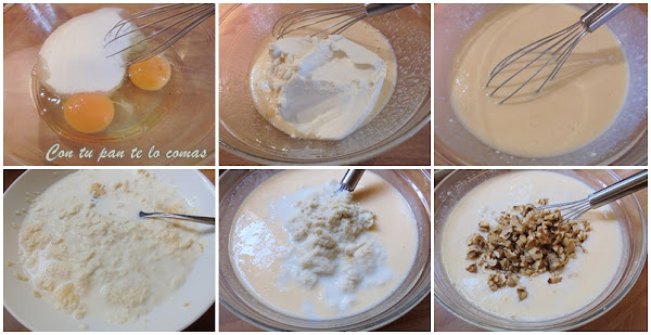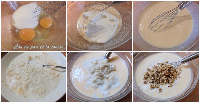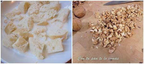 4. Aplasta el pan ahora que ya está blando con un tenedor e incorpóralo a lo anterior. Termina añadiendo las nueces picadas.