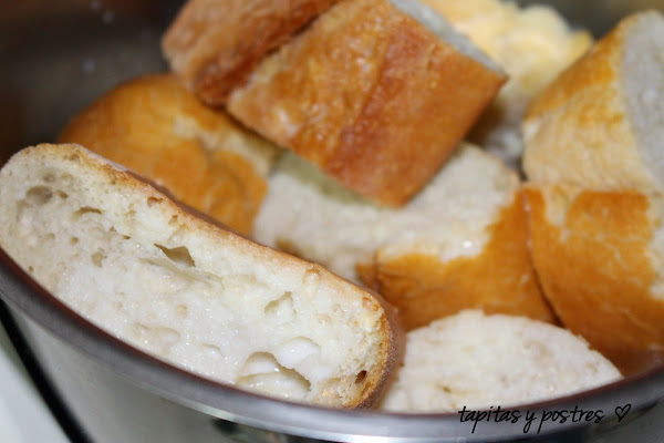 En esta ocasión usé pan duro, con corteza y todo, pero le añadí una latita de leche condensada, que me encanta. La receta la saqué del blog thermofussión, pero quité el licor y modifiqué un pelín la receta original.