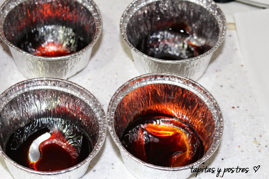 Caramelizamos los moldes. Yo usé una flanera grande con tapa.